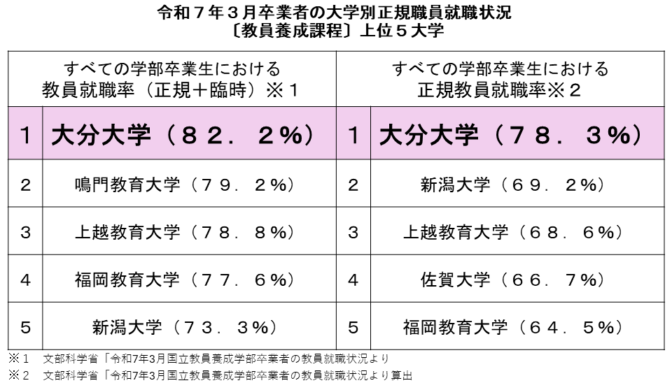 大分大学教育学部は,正規の教員就職率において全国トップの実績を有し,それを6年間にわたって安定的に維持しています。
